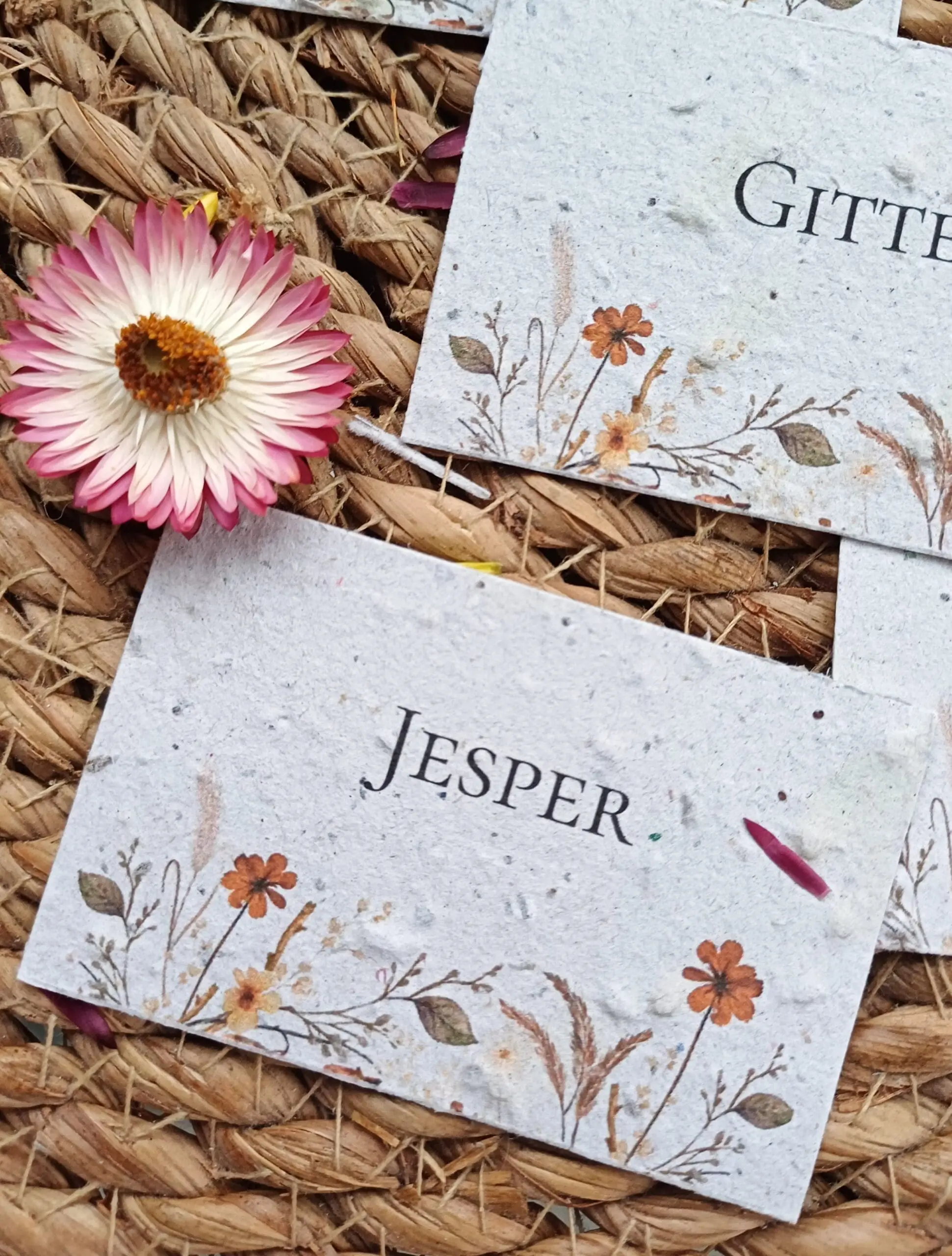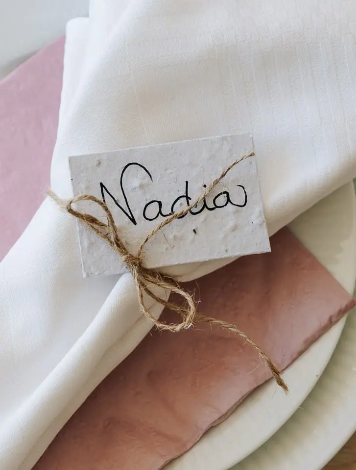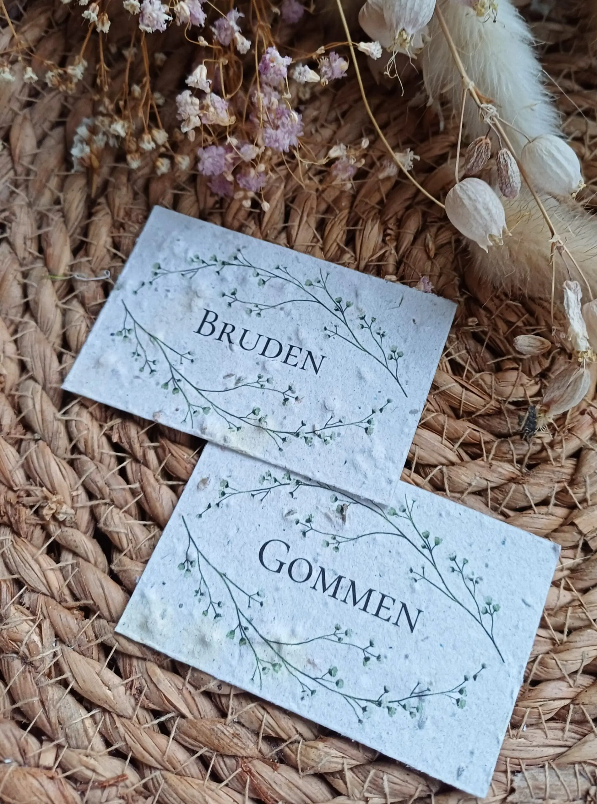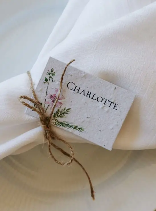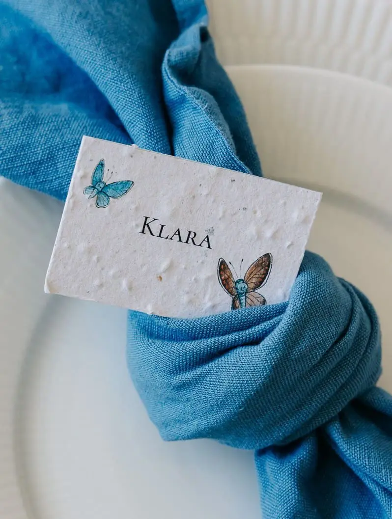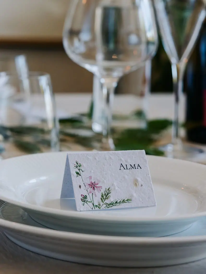 Skilte med bordnumre i frøpapir, som kan blomstre bagefter.