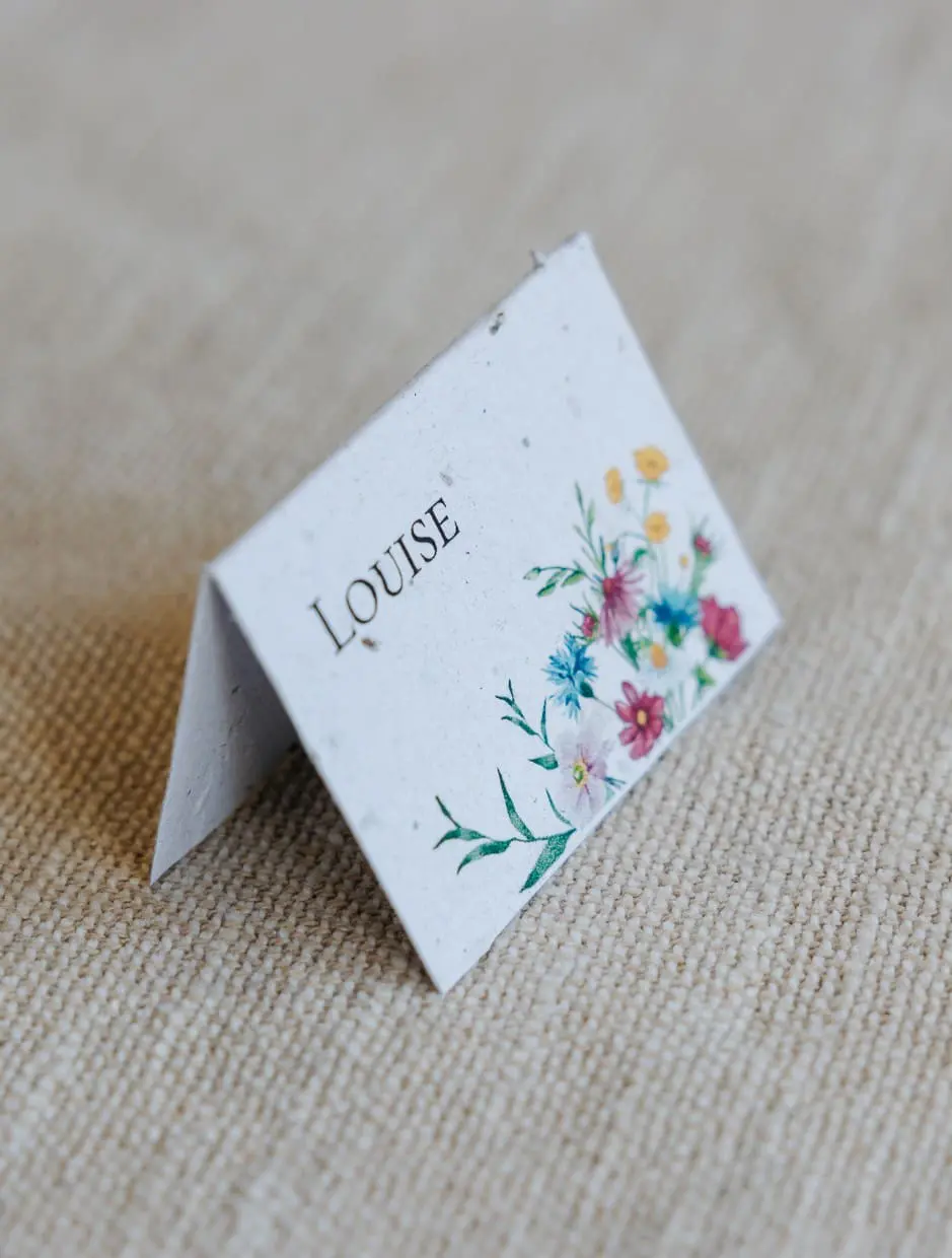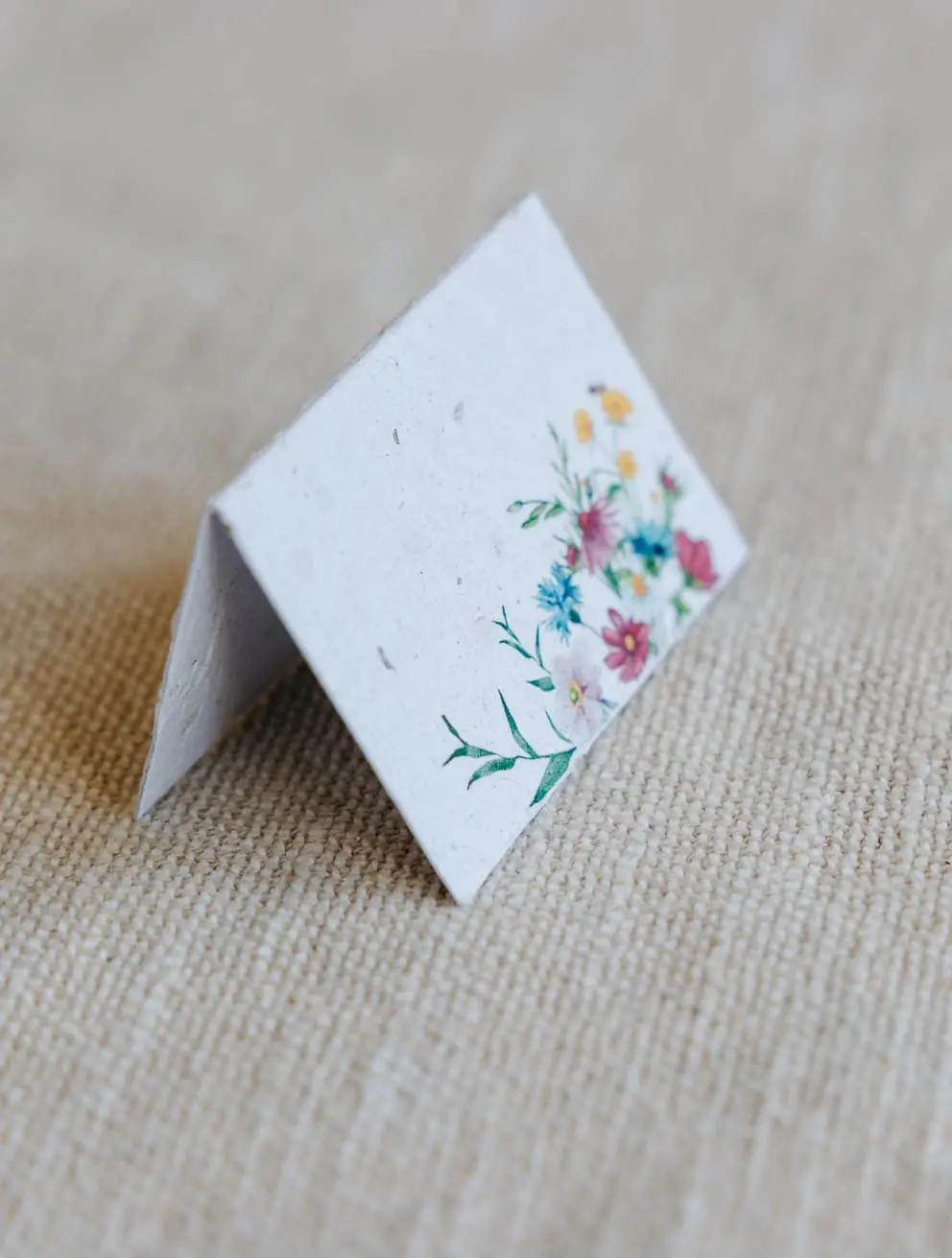 Hvert kort er omhyggeligt fremstillet af genanvendt papir og beriget med en blanding af over 27 hjemmehørende blomsterfrø. Dine gæster kan plante papiret i deres haver eller i en potte på altanen. Det er som at give en lille gave, der vil blomstre og minde dem om den vidunderlige begivenhed, de delte med dig.