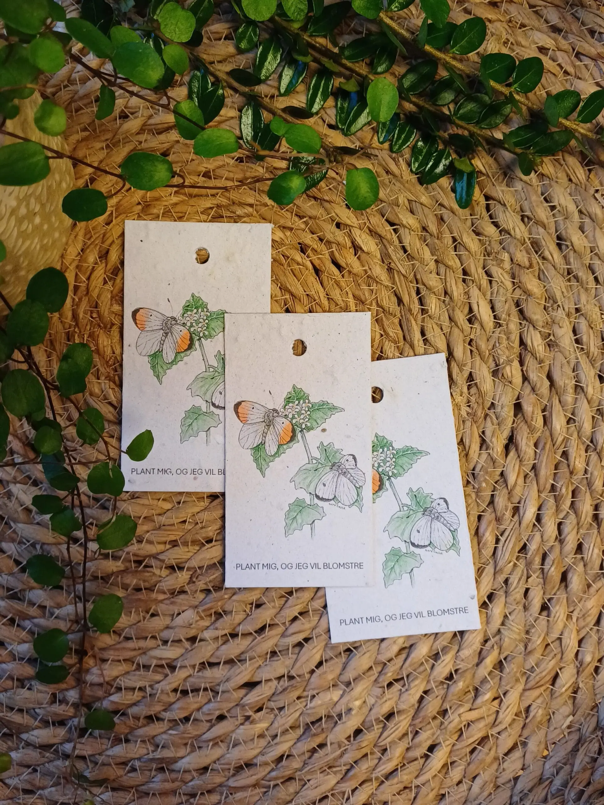 Dette gavemærker gemmer på over 20 vilde blomsterfrø – blandt andet Løgkarse, som pryder forsiden.