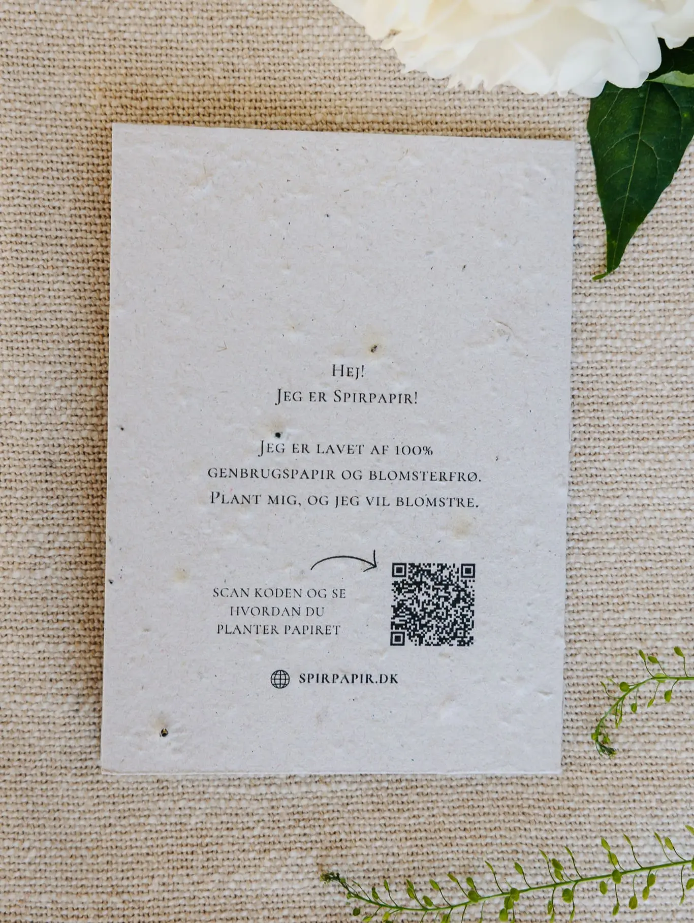 Spirpapir er papir, der får lov til at leve videre. Det er håndlavet i Danmark af genbrugspapir og indeholder blomsterfrø, så det kan plantes efter brug. Det, der starter som et kort, en invitation eller et mærke, ender som vilde blomster og summende liv.