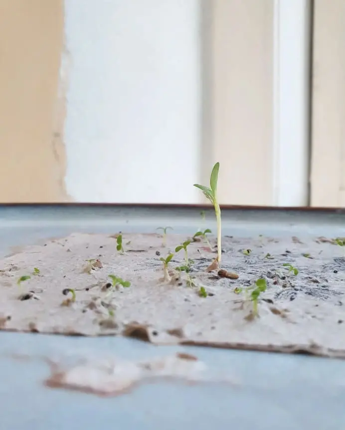 Riv frøpapiret i mindre stykker så det kan fordeles, for at undgå at planterne vokser for tæt. Dæk med et tyndt lag jord og hold fugtig, og du vil se de første spirer indenfor 2-3 uger.